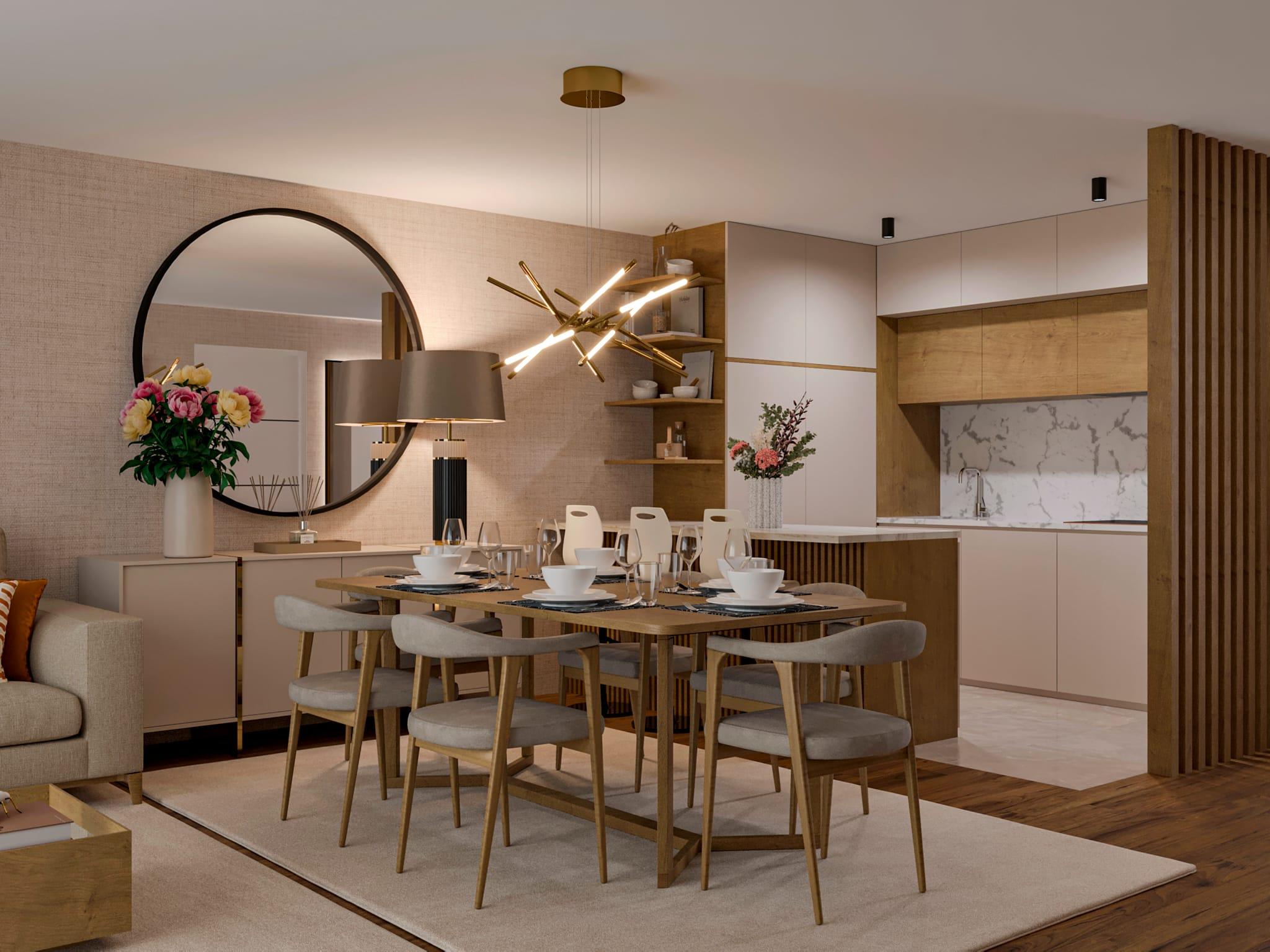 The apartment comprises two east-facing bedrooms, one of them en suite, a spacious kitchen integrated with the living room, pantry/laundry area and two bathrooms functionally distributed. The east/west solar exposure reinforces the amplitude and natural light in all areas.